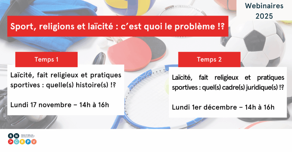 De quoi parle-t-on quand on parle de laïcité dans le sport ? Quels sont les enjeux pour les acteurs du champ sportif ? Quelles conséquences concrètes et quel cadre juridique dans la vie quotidienne des clubs, des collectifs de pratiquants, des bénévoles ? Le réseau national des centres de ressources politique de la ville (RNCRPV) vous propose deux webinaires pour mieux cerner la place du principe de laïcité dans le champ sportif.